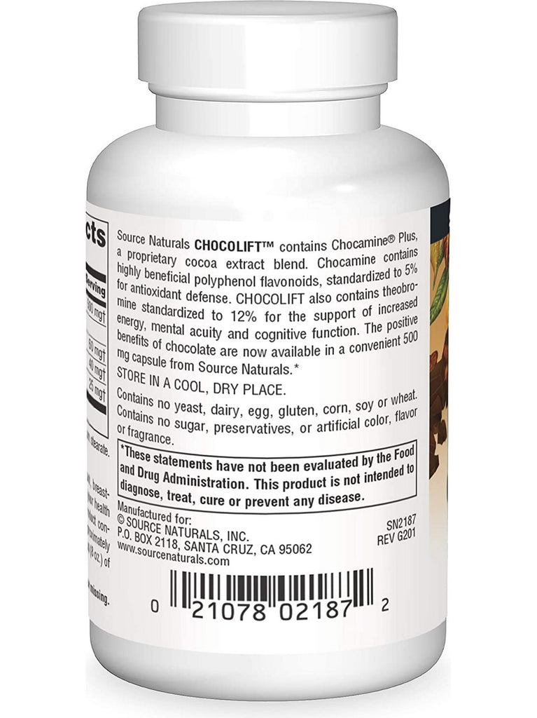 Source Naturals CHOCOLIFT™ contains Chocamine® Plus, a proprietary cocoa extract blend. Chocamine contains highly beneficial polyphenol flavonoids, standardized to 5% for antioxidant defense. CHOCOLIFT also contains theobromine standardized to 12% for the support of increased energy, mental acuity and cognitive function. The positive benefits of chocolate are now available in a convenient 500 mg capsule from Source Naturals.