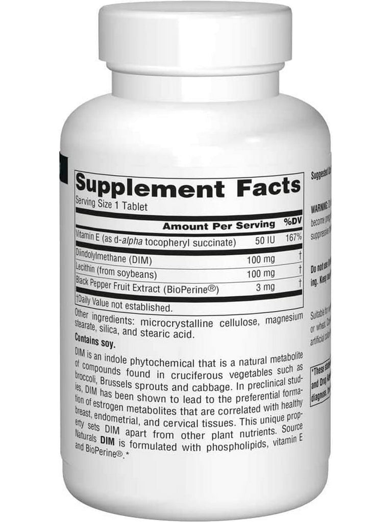 DIM is an indole phytochemical that is a natural metabolite of compounds found in cruciferous vegetables such as broccoli, Brussels sprouts and cabbage. In preclinical studies, DIM has been shown to lead to the preferential formation of estrogen metabolites that are correlated with healthy breast, endometrial, and cervical tissues. This unique property sets DIM apart from other plant nutrients. Source Naturals DIM is formulated with phospholipids, vitamin E and BioPerine®.