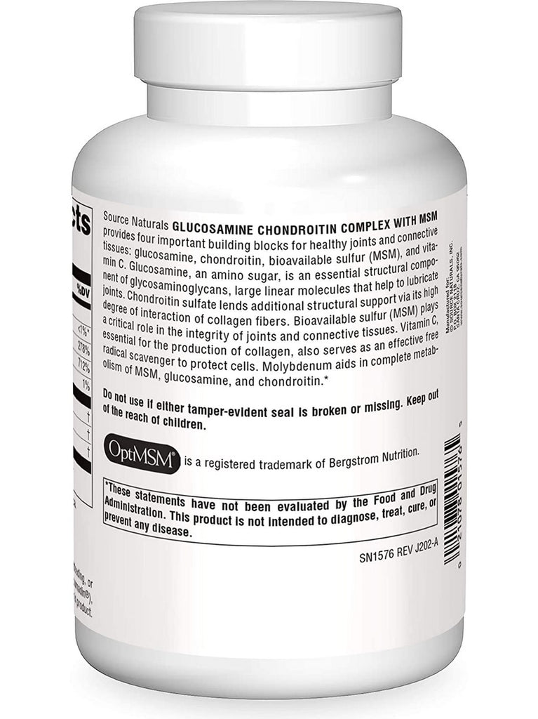 Source Naturals Glucosamine Chondroitin Complex with MSM provides four important building blocks for healthy joints and connective tissues: glucosamine, chondroitin, bioavailable sulfur (MSM), and vitamin C. Glucosamine, an amino sugar, is an essential structural component of glycosaminoglycans, large linear molecules that help to lubricate joints. Chondroitin sulfate lends additional structural support via its high degree of interaction of collagen fibers. Bioavailable sulfur (MSM) plays a critical role in the integrity of joints and connective tissues. Vitamin C, essential for the production of collagen, also serves as an effective free radical scavenger to protect cells. Molybdenum aids in complete metabolism of MSM, glucosamine, and chondroitin.