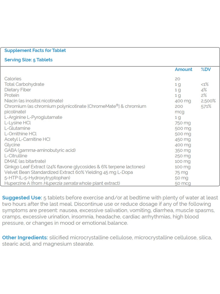 5 tablets before exercise and/or at bedtime with plenty of water at least two hours after the last meal. Discontinue use or reduce dosage if any of the following symptoms are present: nausea, excessive salivation, vomiting, diarrhea, muscle spasms, cramps, excessive urination, insomnia, headache, cardiac arrhythmias, high blood pressure, or changes in mood or emotional balance.