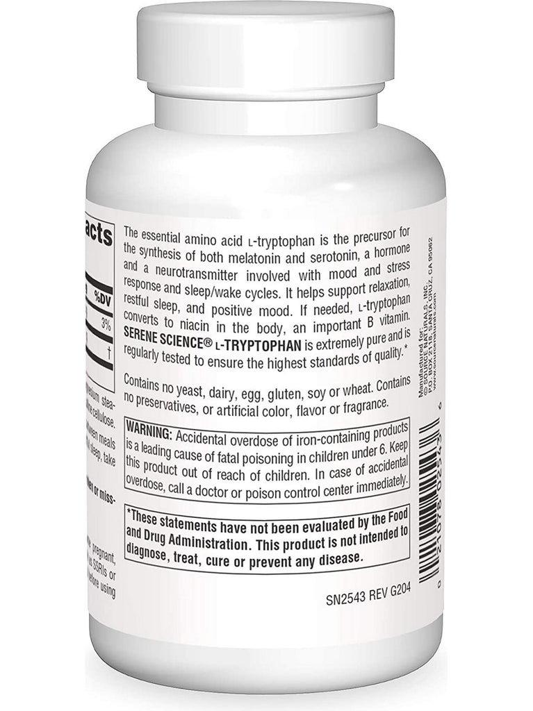 The essential amino acid l-tryptophan is the precursor for the synthesis of both melatonin and serotonin, a hormone and a neurotransmitter involved with mood and stress response and sleep/wake cycles. It helps support relaxation, restful sleep, and positive mood. If needed, l-tryptophan converts to niacin in the body, an important B vitamin. SERENE SCIENCE® L-TRYPTOPHAN is extremely pure and is regularly tested to ensure the highest standards of quality.