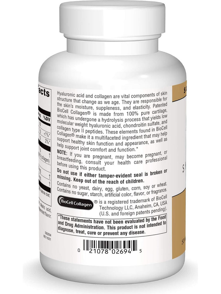 Hyaluronic acid and collagen are vital components of skin structure that change as we age. They are responsible for the skin’s moisture, suppleness, and elasticity. Patented BioCell Collagen® is made from 100% pure cartilage, which has undergone a hydrolysis process that yields low molecular weight hyaluronic acid, chondroitin sulfate, and collagen type II peptides. These elements found in BioCell Collagen® make it a multifaceted ingredient that may help support healthy skin function and appearance, as well as help support joint comfort and function.