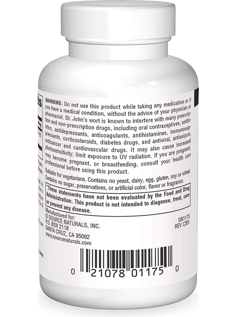 Source Naturals St. John's Wort 450™ is standardized to consistently supply 0.3% hypericins. A daily intake of St. John’s wort standardized to 2.7 mg hypericins may support a positive outlook and mood. Benefits may be experienced within 4 to 6 weeks of initial use.