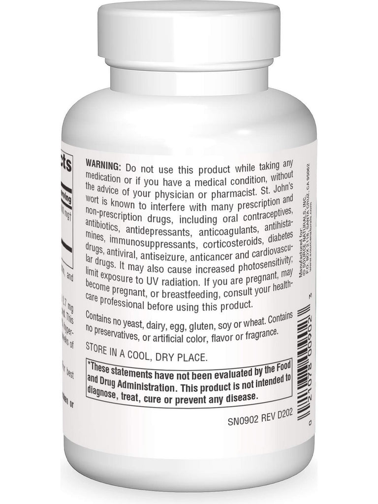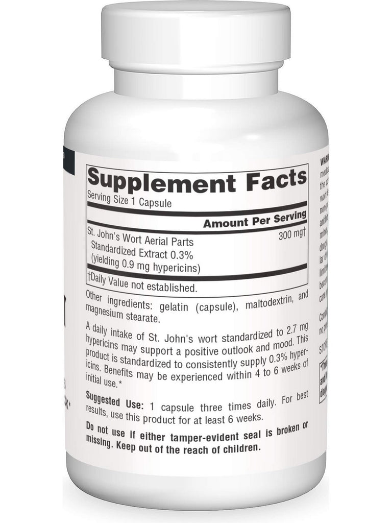 Source Naturals St. John's Wort Extract is standardized to consistently supply 0.3% hypericins. A daily intake of St. John’s wort, standardized to 2.7 mg of hypericins, may support a positive outlook and mood. Benefits may be experienced within 4 to 6 weeks of initial use.