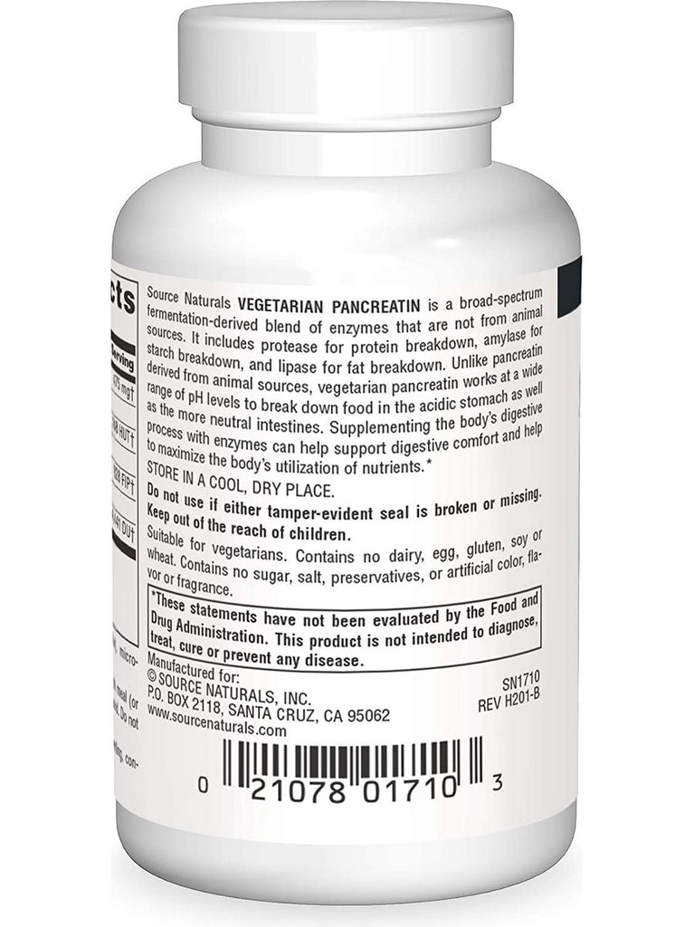 Source Naturals Vegetarian Pancreatin is a broad-spectrum fermentation-derived blend of enzymes that are not from animal sources. It includes protease for protein breakdown, amylase for starch breakdown, and lipase for fat breakdown. Unlike pancreatin derived from animal sources, vegetarian pancreatin works at a wide range of pH levels to break down food in the acidic stomach as well as the more neutral intestines. Supplementing the body’s digestive process with enzymes can help support digestive comfort and help to maximize the body’s utilization of nutrients.