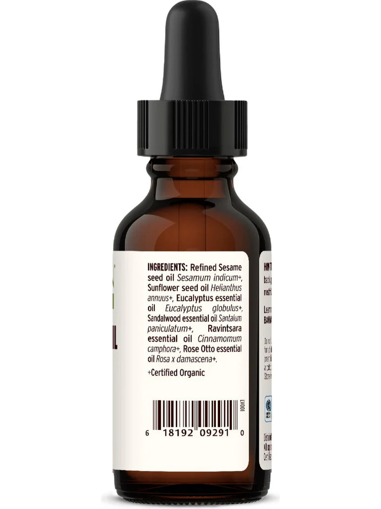 Refined Sesame seed oil (Sesamum indicum)+, Sunflower seed oil (Helianthus annuus)+, Eucalyptus essential oil (Eucalyptus globulus)+, Sandalwood essential oil (Santalum paniculatum)+, Ravintsara essential oil (Cinnamomum camphora)+, Rose Otto essential oil (Rosa x damascena)+.