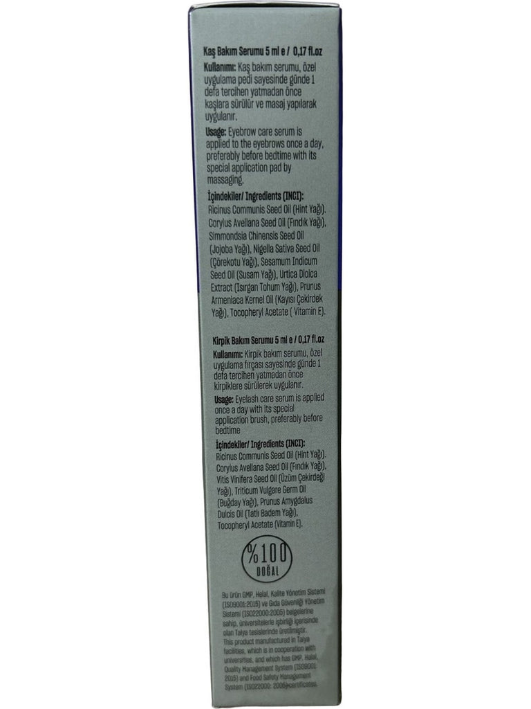 Talya Eyebrow and Eyelash Care Serum is specially formulated, all natural oil blend for both eyelashes and eyebrow care. It contains Castor Oil, Hazelnut Oil, Jojoba Oil, Black Seed Oil, Sesame Oil, Nettleseed Oil, Apricot Seed Oil and Vitamin E. This serum keeps hair follicles in a prolonged growth phase, allowing lashes and brows to achieve greater length.