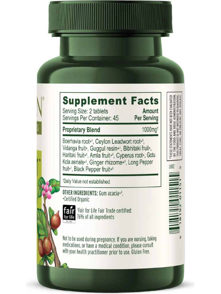 Each 500 mg tablet contains: Punarnava root (Boerhaavia diffusa)*, Chitrak root (Plumbago zeylanica)*, Vidanga fruit (Embelia ribes)*, Bibhitaki fruit (Terminalia belerica)*, Haritaki fruit (Terminalia chebula)*, Amalaki fruit (Emblica officinalis)*, Guggulu resin (Commiphora mukul), Musta root (Cyperus rotundus)*, Brahmi leaf (Hydrocotyle asiatica)*, Ginger root (Zingiber officinale)*, Pippali fruit (Piper longum)*, Shilajit, Black Pepper fruit (Piper nigrum)*
