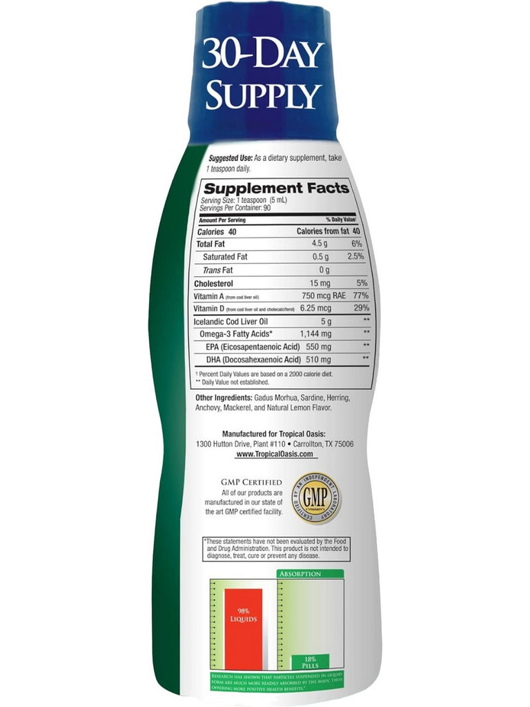 If you’re looking for an easy way to enjoy the benefits of Omega-3s without the powerful, fishy after-taste, turn to Tropical Oasis premium Icelandic Cod Liver Oil - 16oz with 1,143 mg of Omega-3. Our premium formula helps reduce fishy burps, so you can reap the benefits of EPA and DHA Omega-3s without the overwhelming smell of ocean fish.