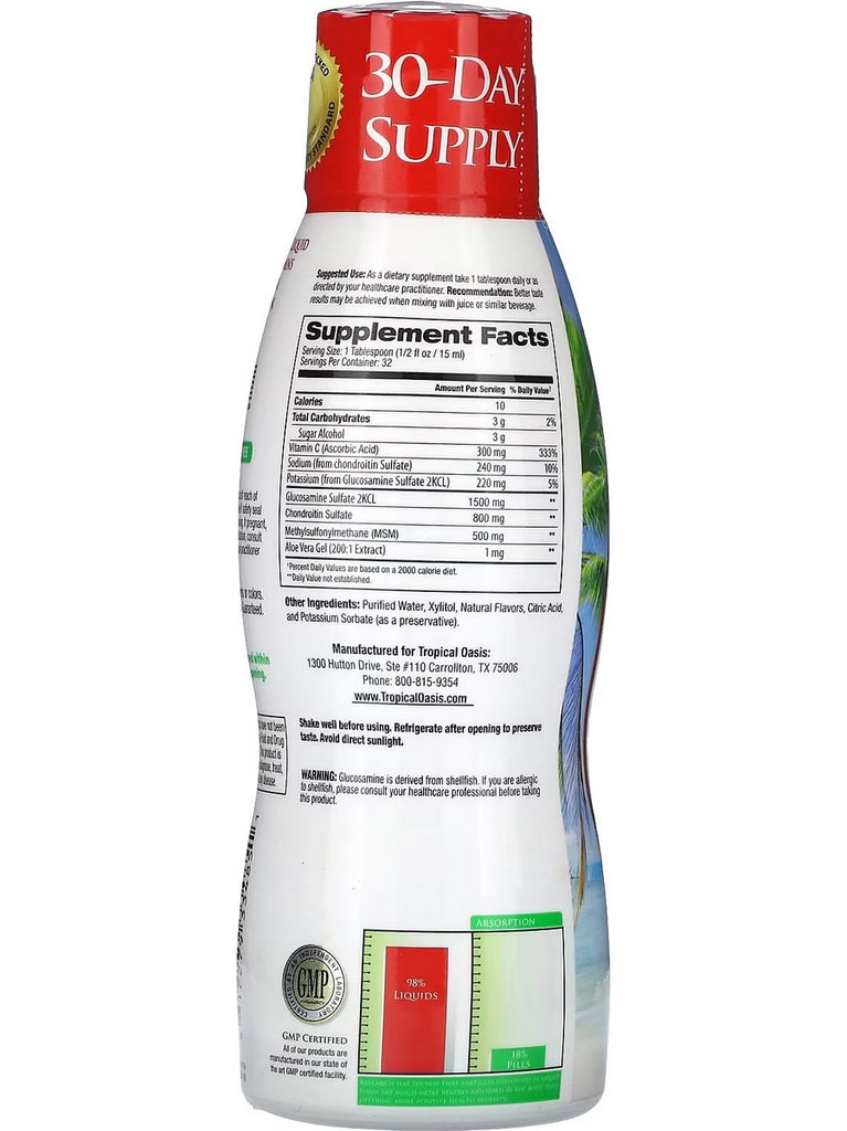 Tropical Oasis Liquid Glucosamine Chondroitin with MSM is an ultra-concentrated blend of Glucosamine, Chondroitin, MSM, and Vitamin C. These ingredients have been shown to help maintain joint health!