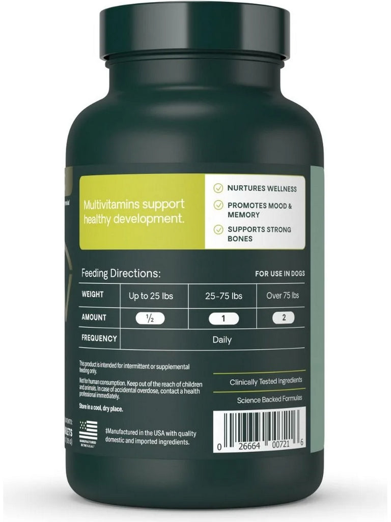 Formulated with a balance of vitamins, minerals and fish oil omegas, Canine Plus promotes cardiovascular, digestive and immune system health. Biotin and thiamine support cognitive function, mood and memory. Omega 3 & 6 support skin and coat health. Vitamins A, C, E and selenium are antioxidants that support immune system and skin health. Methionine, an amino acid, is a building block of many critical bodily functions, supports brain health, cell recovery, and energy production. Chewable tablets help maintain the overall physical well-being of your dog, no matter their size, age or breed.