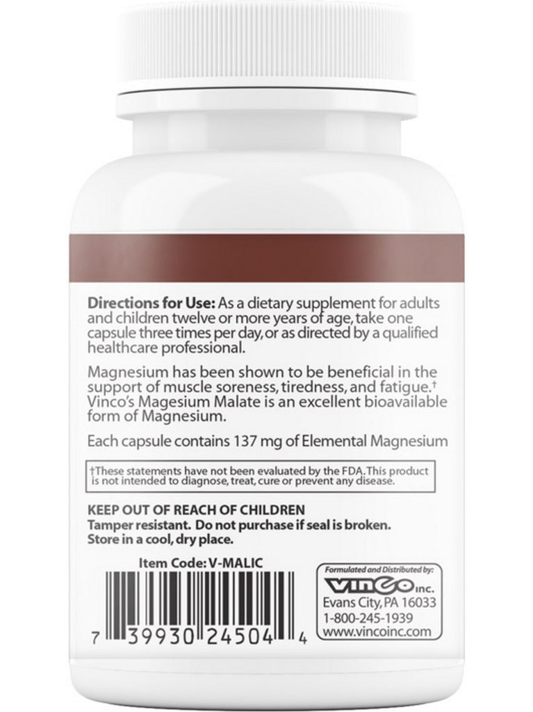 Whether you are recovering from a hard workout or a long day on the job, muscle soreness, tiredness, and fatigue are common conditions in our day to day lives. While you may think you are getting enough magnesium in your diet to support your body in recovery, studies have shown that many people do not get enough magnesium to handle the many body processes it is needed for. Vinco’s Magnesium Malate helps to support your daily magnesium intake and it comes in a highly bioavailable form.