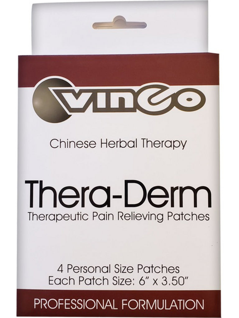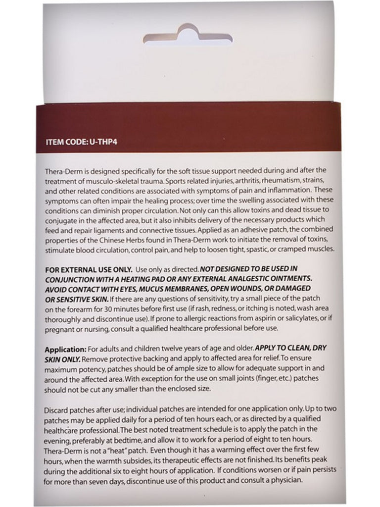 - Applied as an adhesive patch, the combined properties of the Chinese Herbs found in Thera-Derm work to initiate the removal of toxins, stimulate blood circulation, control pain, and help to loosen tight, spastic, or cramped muscles.