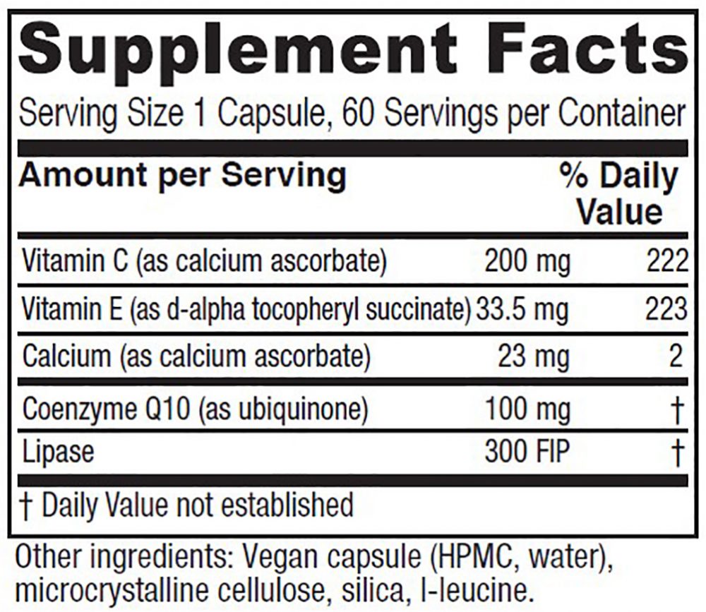 - Lipase is included to support better absorption since CoQ10 is a fat soluble nutrient.