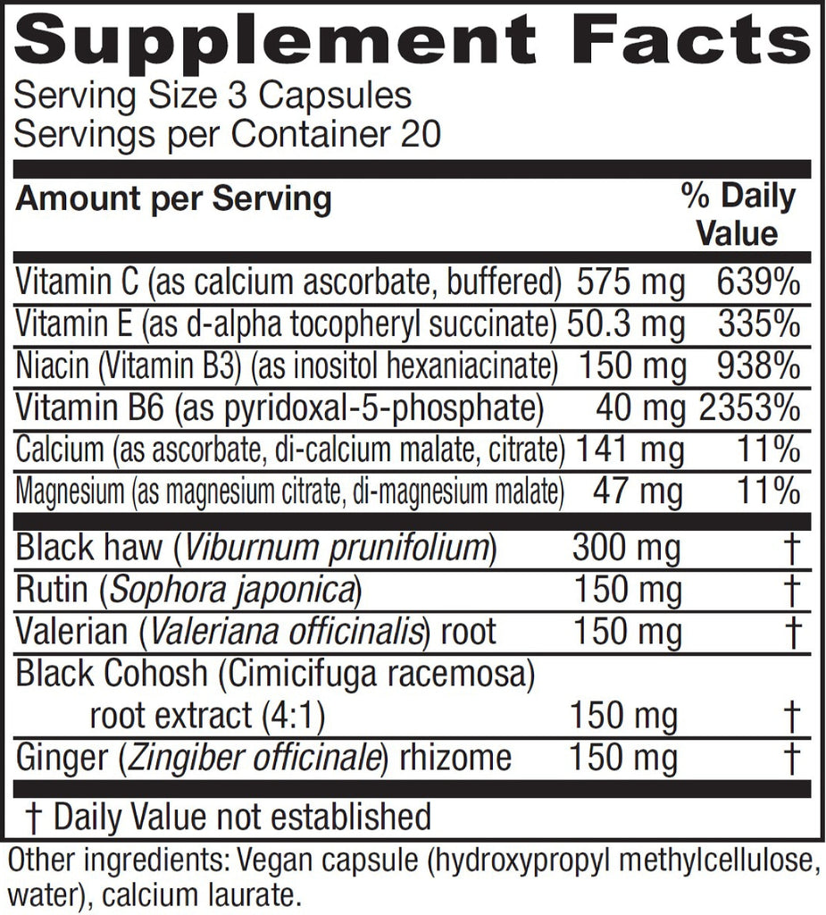 Temporary support, 1-3 capsules every three hours; up to four times daily during menstruation. A maintenance dose of 3 capsules, once daily may be taken 1-2 days before menstruation. The maintenance dose may also be taken as needed to support muscle tissue relaxation anywhere in the body; also suitable for men.