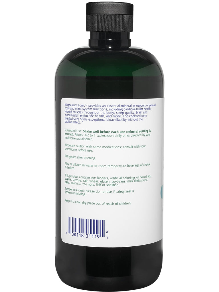 Magnesium is an essential mineral for human health and wellness. Due to the likely deficiency for most people, this bisglycinate liquid Tonic promotes optimal absorption to maintain healthy magnesium levels with great taste and without the typical laxative side effects.
