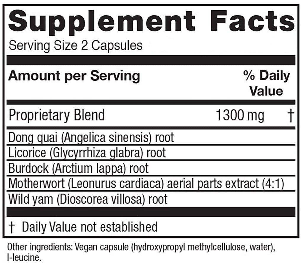 - Phytoestrogenic support for menopause and maintenance support for healthy breasts, bone and heart tissues from Licorice root, Dong quai and Wild yam