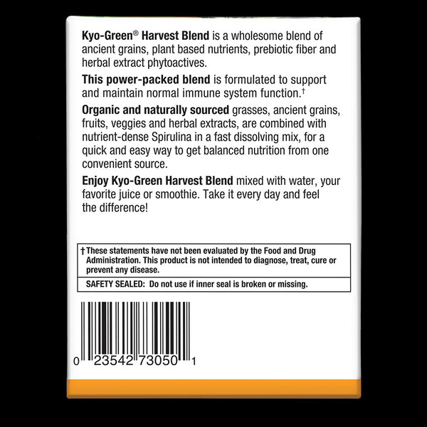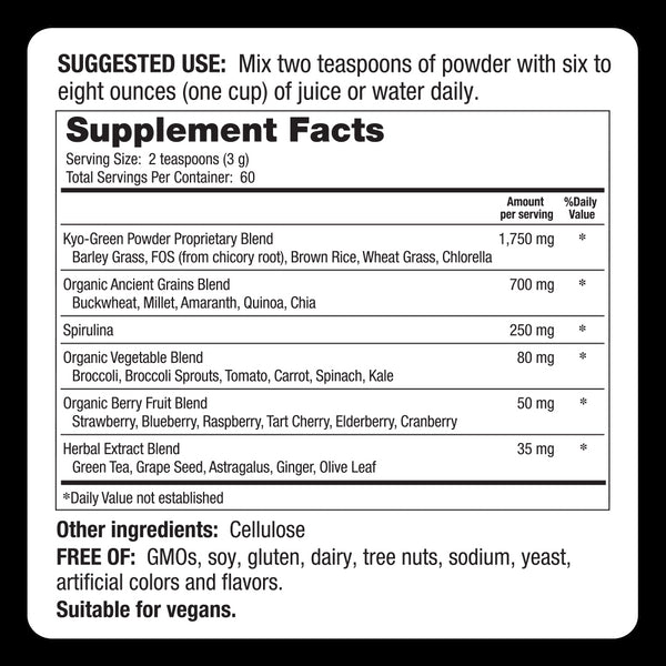 Mix one serving of fast dissolving Kyo-Green Harvest Blend powder with water or fruit juice, or add to your favorite smoothie.
