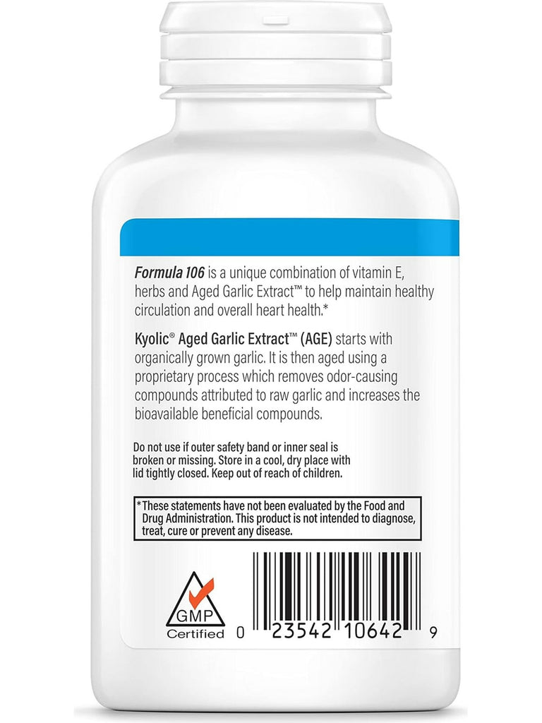 Kyolic Aged Garlic Extract Formula 106 for Circulation contains 600 mg of AGE and a unique blend of Vitamin E with Hawthorn Berry and Cayenne Pepper serving. This formula was designed to help maintain healthy circulation, normal cholesterol levels and overall heart health.
