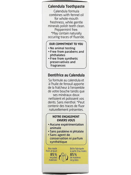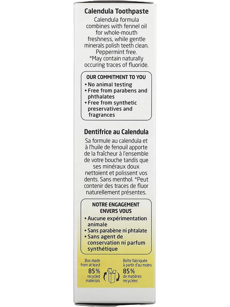 In Calendula Toothpaste, every ingredient counts towards fresh breath and a clean mouth. Calming calendula helps soothe sensitive gums, calcium mineral has a gentle abrasive action, and fennel essential oil gives a fresh, pleasant taste. There's no peppermint, so it won’t interfere or irritate palates with mint sensitivities.