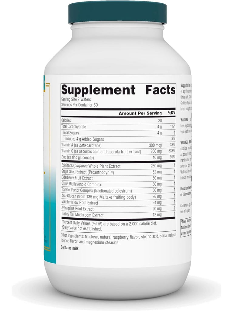Wellness Immune Chewable is a robust formula designed to mobilize immune defenses during the cold weather season. A powerful herbal-nutrient blend - including echinacea, elderberry, astragalus, marshmallow root, mushroom extracts, and zinc - is combined with advanced special ingredients such as beta glucan and transfer factor. Wellness Immune Chewable is carefully formulated to address the body's intricate immune system by various biological pathways.