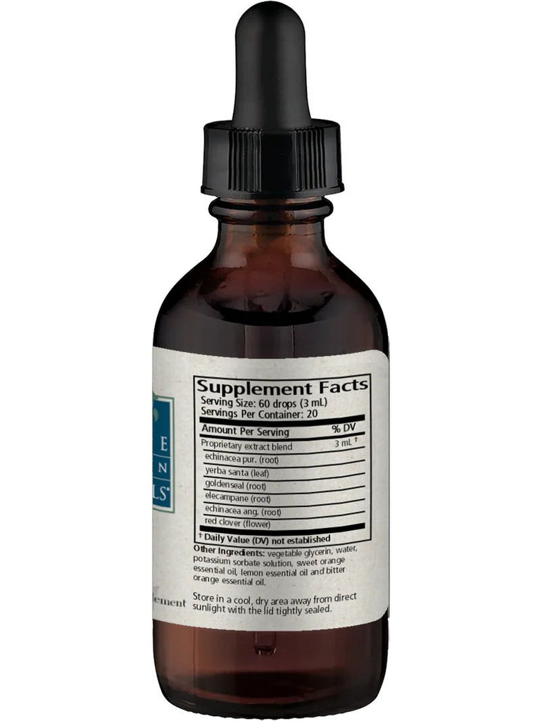 Echinacea pur., yerba santa, goldenseal, elecampane, echinacea ang. and red clover in a base of vegetable glycerin and mountain spring water with essential oils of sweet orange, lemon and bitter orange with potassium sorbate 0.1%.