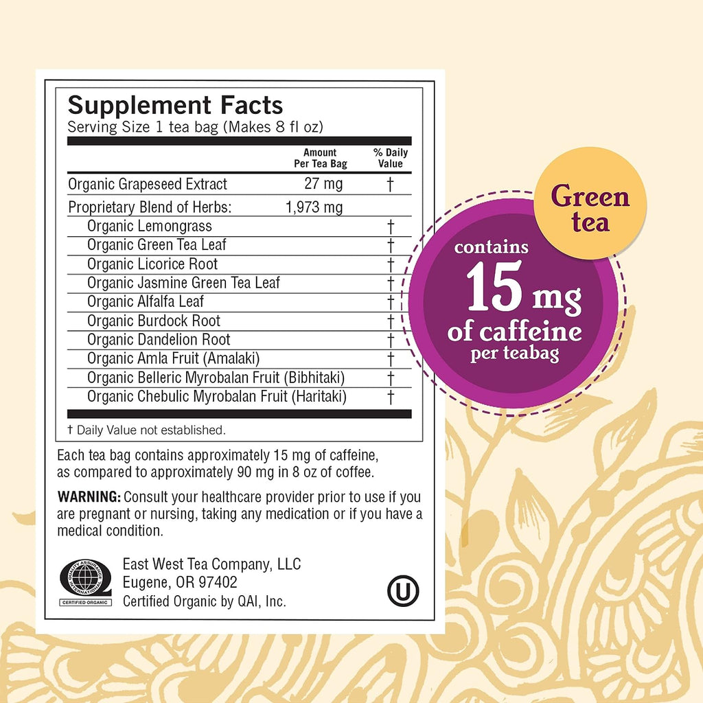 Organic Lemongrass, Organic Green Tea Leaf, Organic Licorice Root, Organic Jasmine Green Tea Leaf, Organic Alfalfa Leaf, Organic Burdock Root, Organic Dandelion Root, Organic Grapeseed Extract, Organic Amla Fruit (Amalaki), Organic Belleric Myrobalan Fruit (Bibhitaki), Organic Chebulic Myrobalan Fruit (Haritaki).