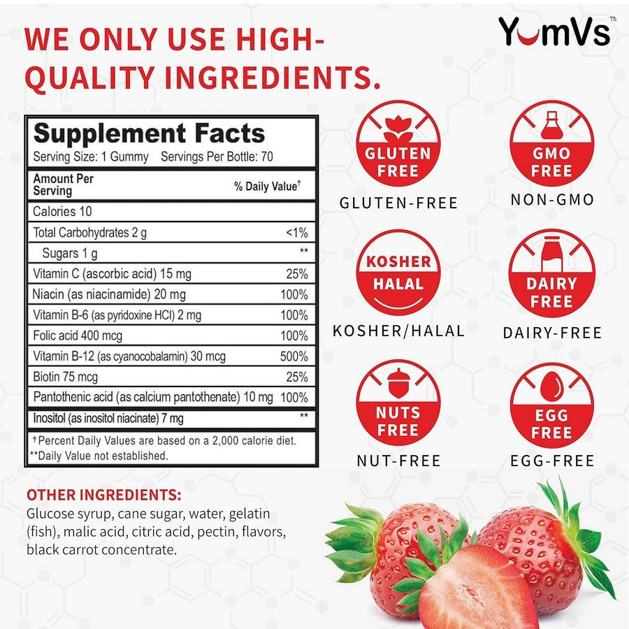 - YUMV'S B-COMPLEX + VITAMIN C Daily dietary supplement for men, women and children. Natural strawberry-flavor jellies contain Vitamins B6, B12, C, Folic Acid, Niacin, and Biotin.